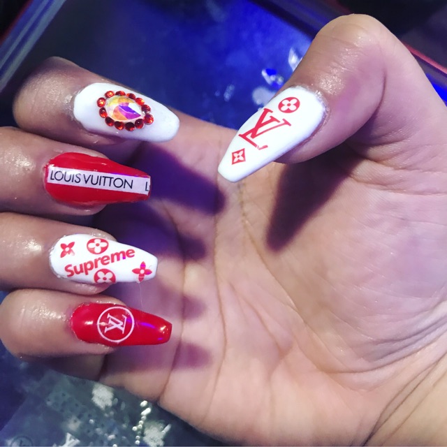 Honey Phan On Instagram Louis Vuitton X Supreme Coffinnails Nailart Handsondesign Rednails Gucci Nails Nails Design With Rhinestones Long Acrylic Nails