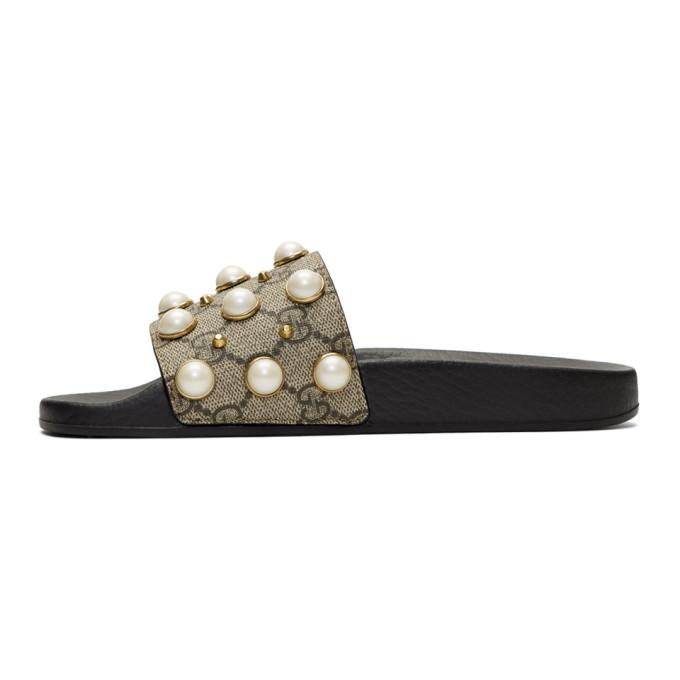 Gucci Beige Gg Supreme Coated Canvas Faux Pearl Pool Slides Size 4 5 35 Yoogi S Closet