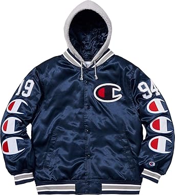 Amazon Com Supremenewyork Supreme Champion Chaqueta De Varsidad De Saten Con Capucha Color Azul Marino Fw18 100 Autentico Se Vende Fuera M Clothing