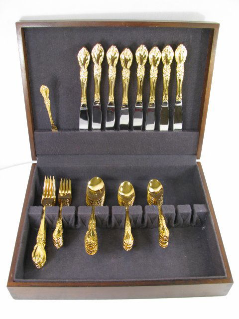 Towle Gold Plated King Arthur 66 Piece Service For 12 Flatware Set With 5 Piece Place Setting With 6 Serving Pieces In Storage Box Second Wind Vintage