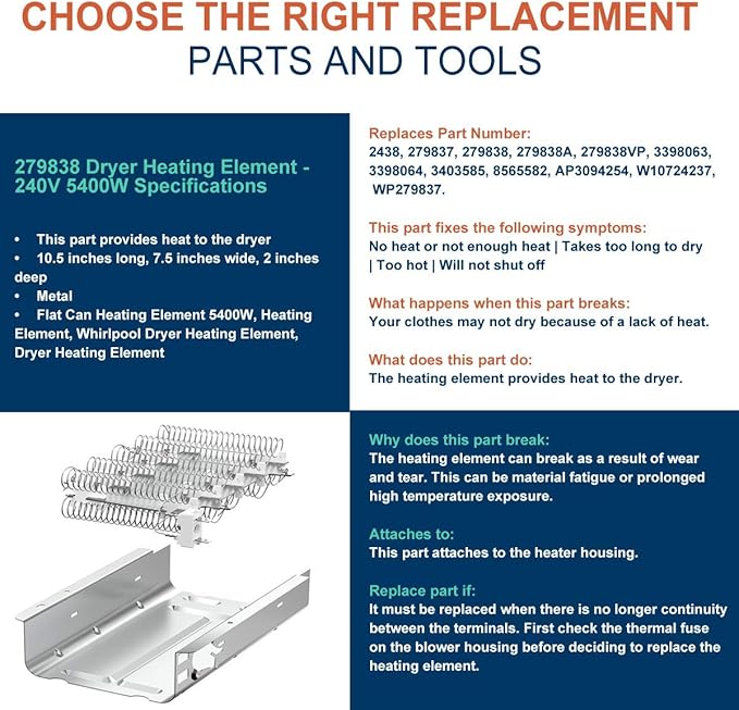 Amazon Com 279838 Dryer Heating Element For Whirlpool Roper Kenmore Dryer Heating Element Parts 3392519 3977393 Thermal Fuse 3387134 3977767 Dryer Thermostat 279838 Replaces 8565582 Ap309425 3398064 3403585 Health Personal Care