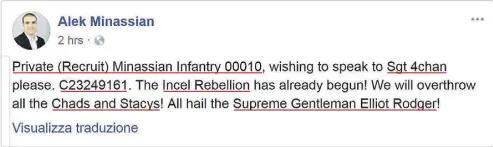 Catherine Mcdonald On Twitter We Ve Just Obtained This Facebook Post From The Accused Alek Minassian Suspected In The Yongeandfinch Mass Casualty Posted Early This Afternoon Fyi Incel Involuntarily Celibate Elliot Rodger Killed 6