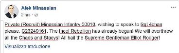 Alek Minassian 2 Hrs Private Recruit Minassian Infantry 00010 Wishing To Speak To Sgt 4chan Please C23249161 The Incel Rebellion Has Already Begun We Will Overthrow All The Chads And Stacys All