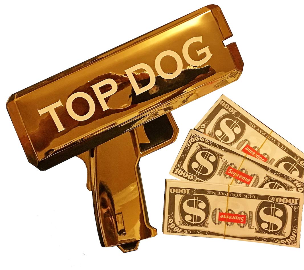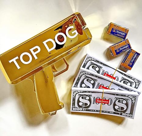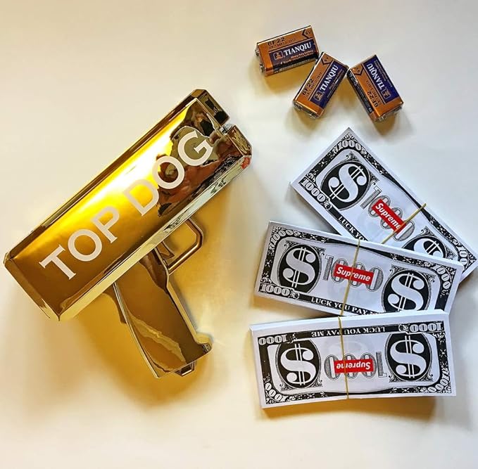 Amazon Com Super Money Spray Cash Gun Supreme Shooter Gun In Golden Impress Your Friends By Making It Rain Dollars Holds Up To 100 Pcs Of Money Bonus Supreme Stickers Toys Games