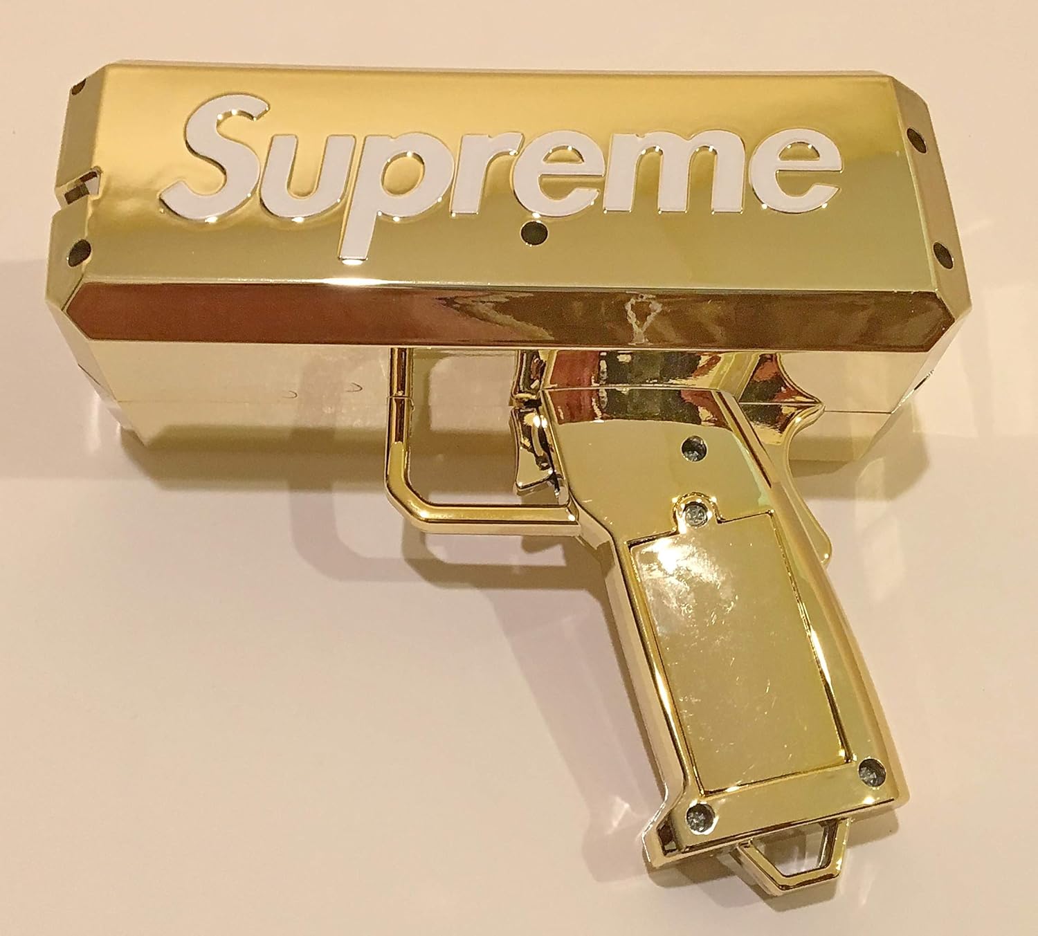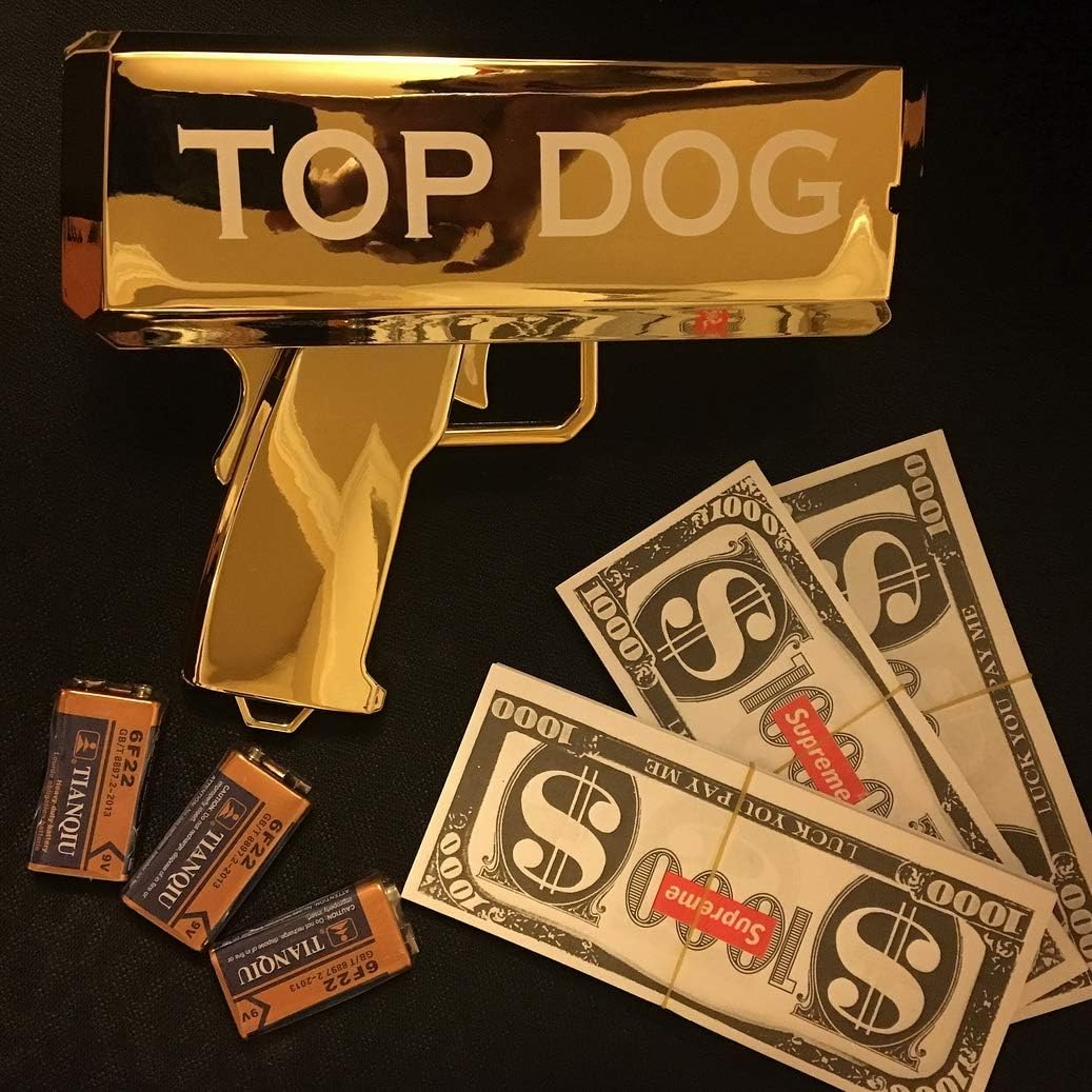 Amazon Com Super Money Spray Cash Gun Supreme Shooter Gun In Golden Impress Your Friends By Making It Rain Dollars Holds Up To 100 Pcs Of Money Bonus Supreme Stickers Toys Games